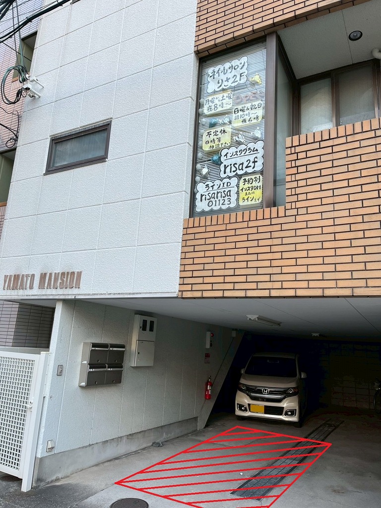 | 駐車場 | 無料駐車1台(小型車までOK) ![]() 赤枠の白い車の前に置いて下さい |